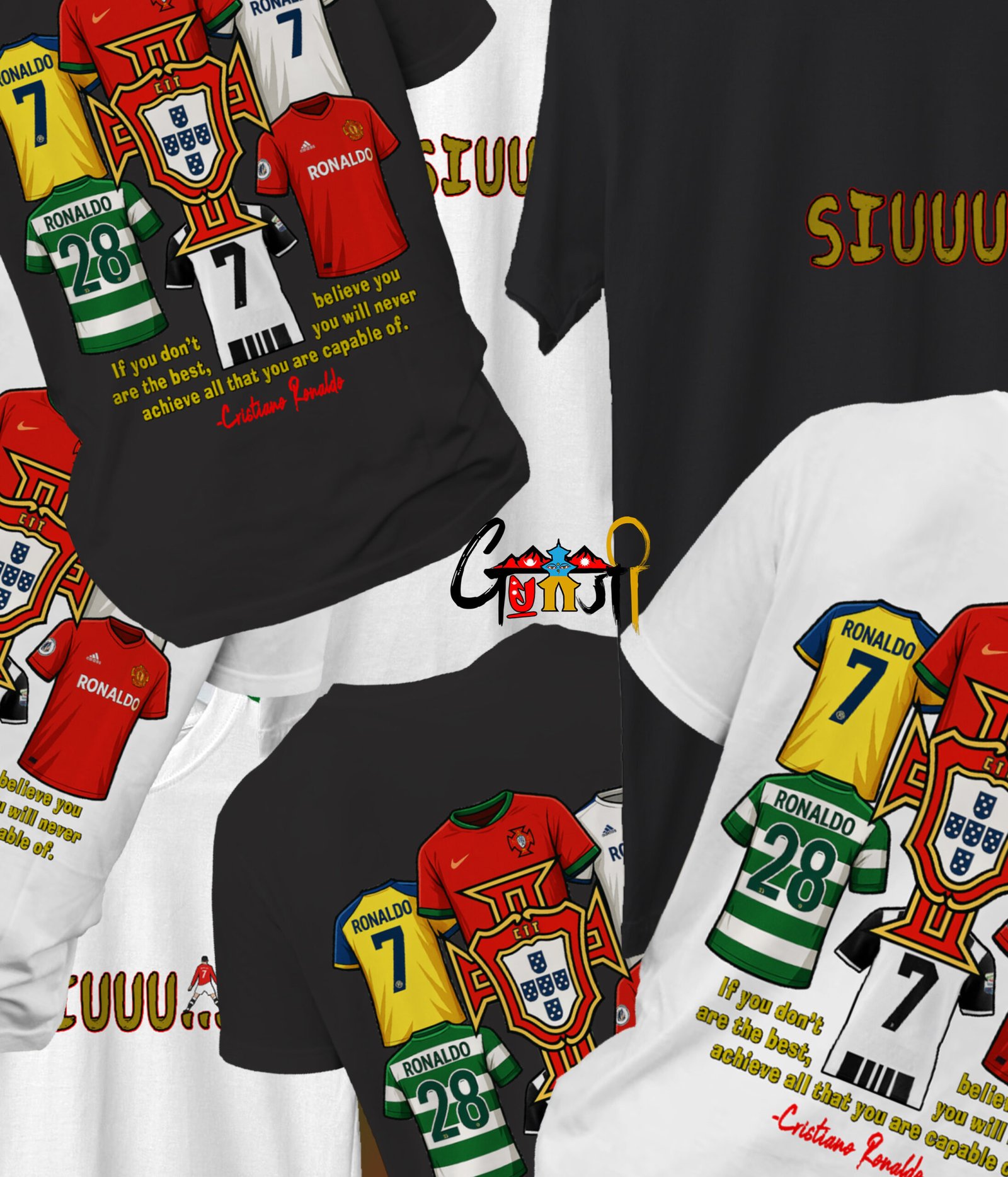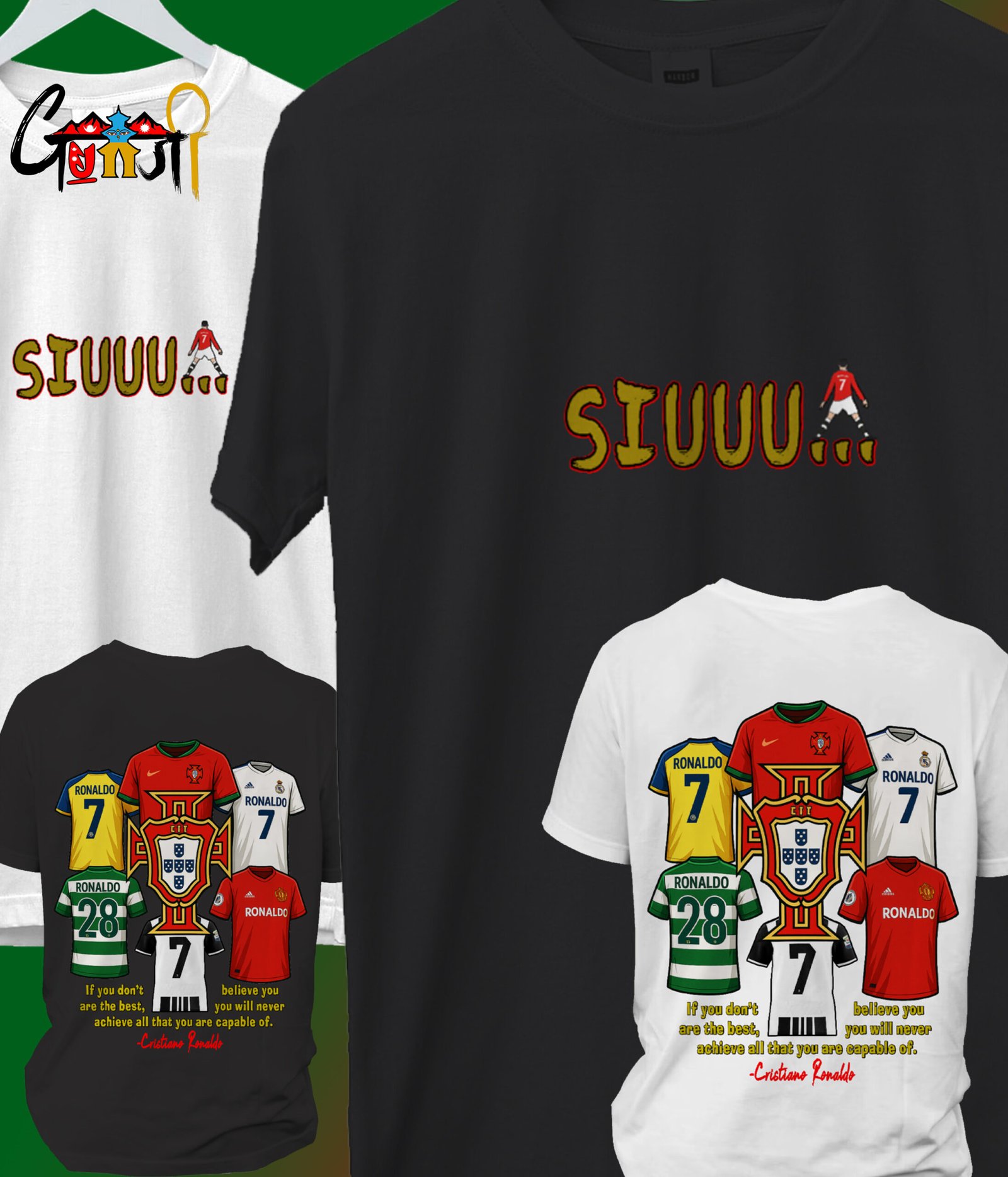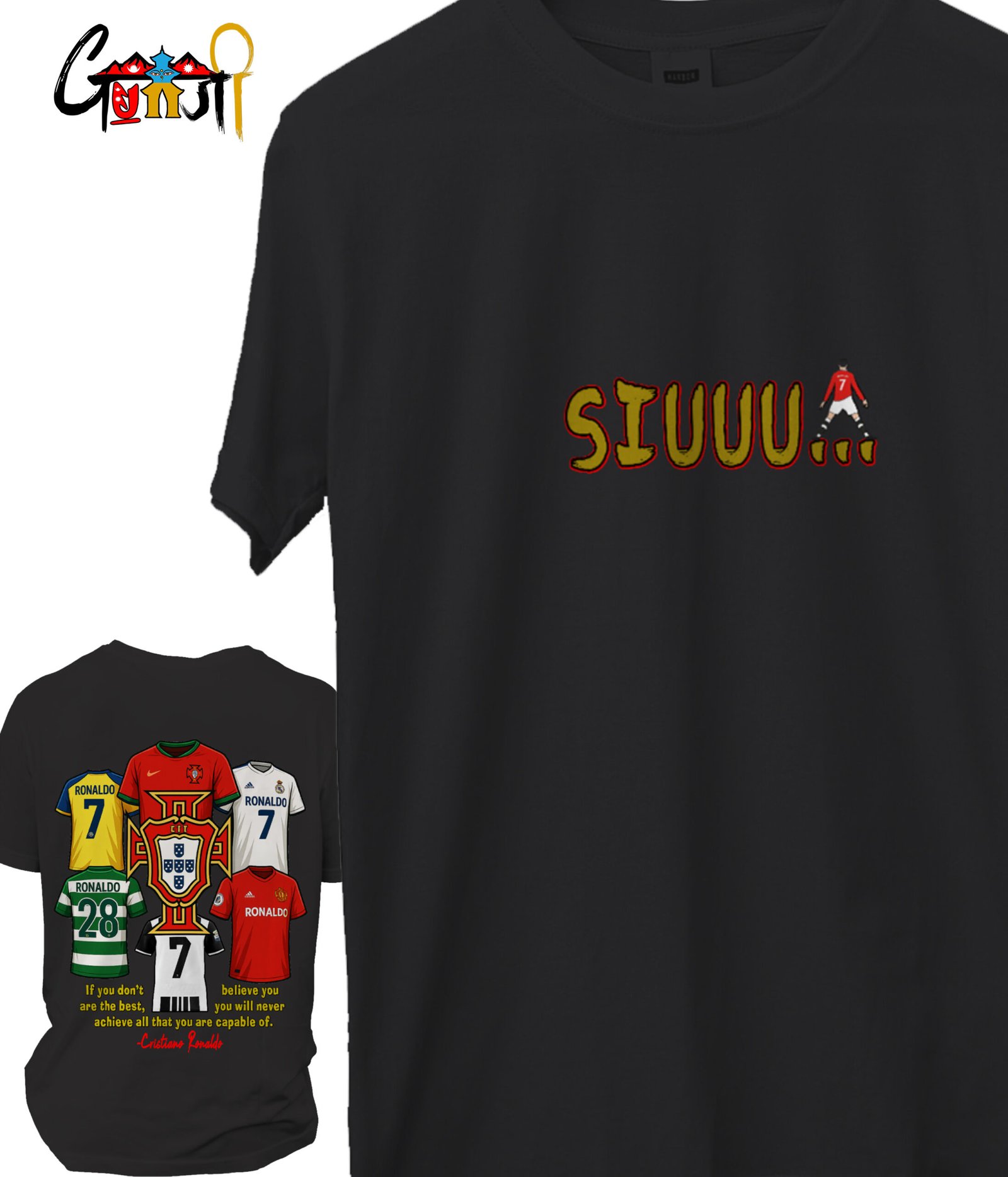 👕 Double-Sided Print – “Siuuu” with Ronaldo image on front, his full club journey on the back.