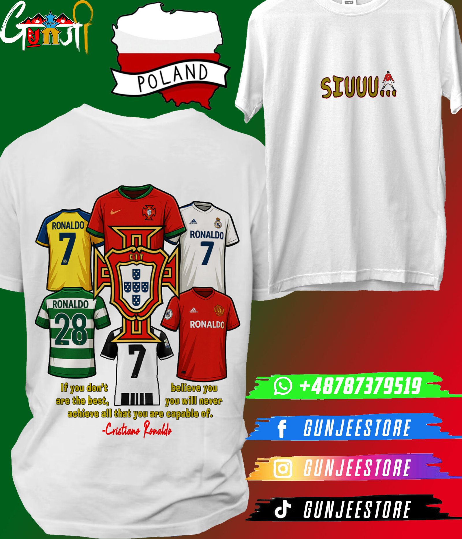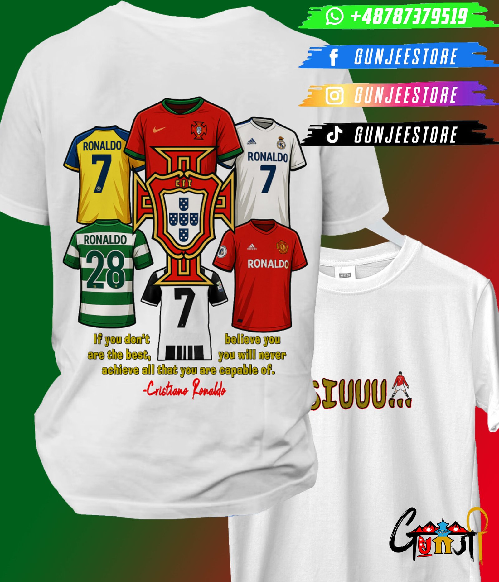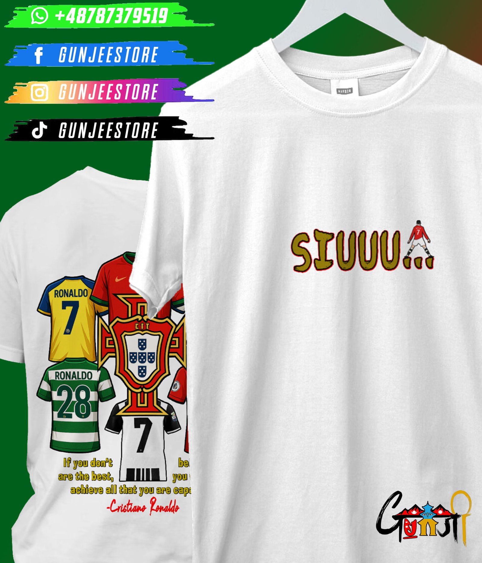 👕 Double-Sided Print – “Siuuu” with Ronaldo image on front, his full club journey on the back.