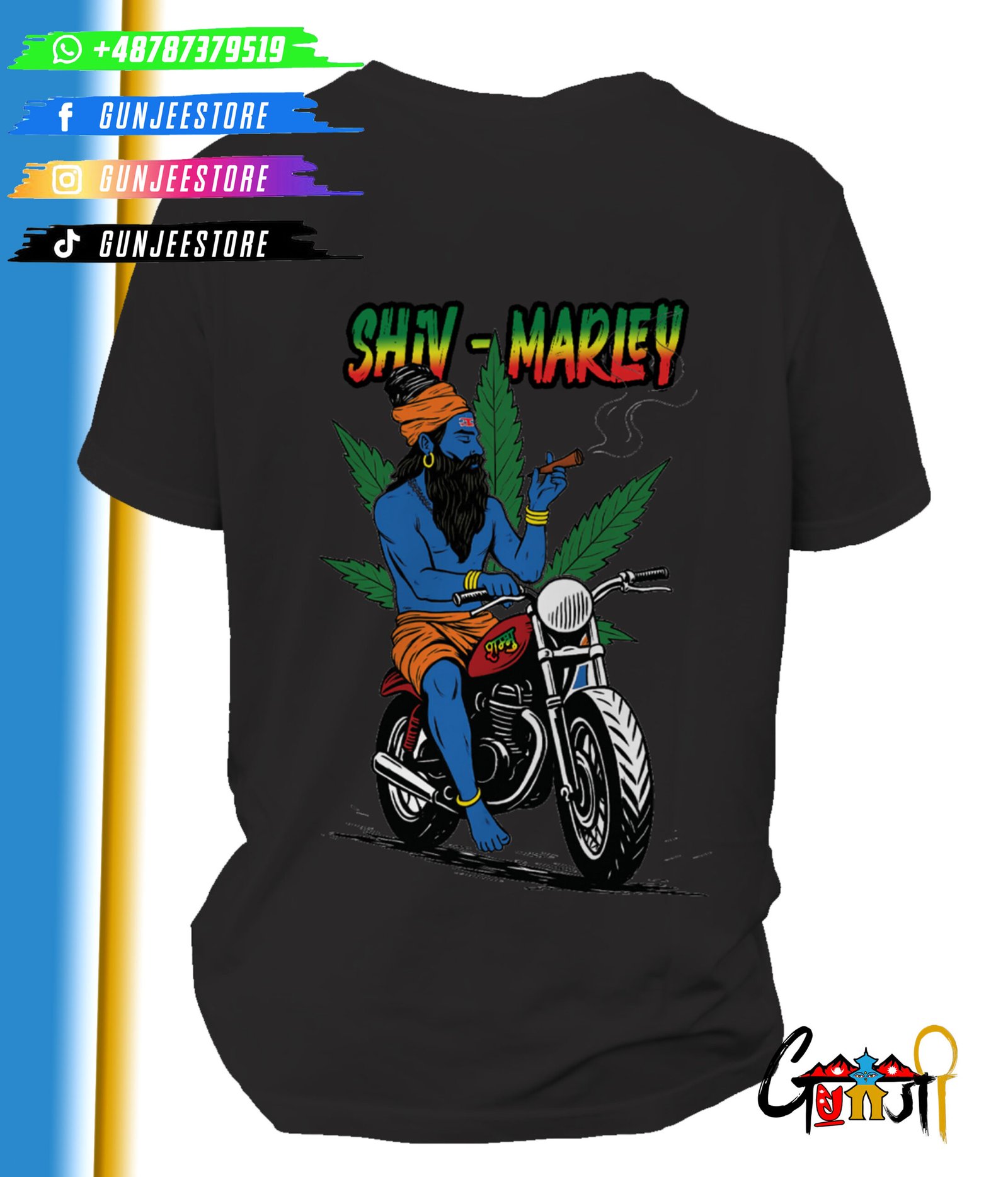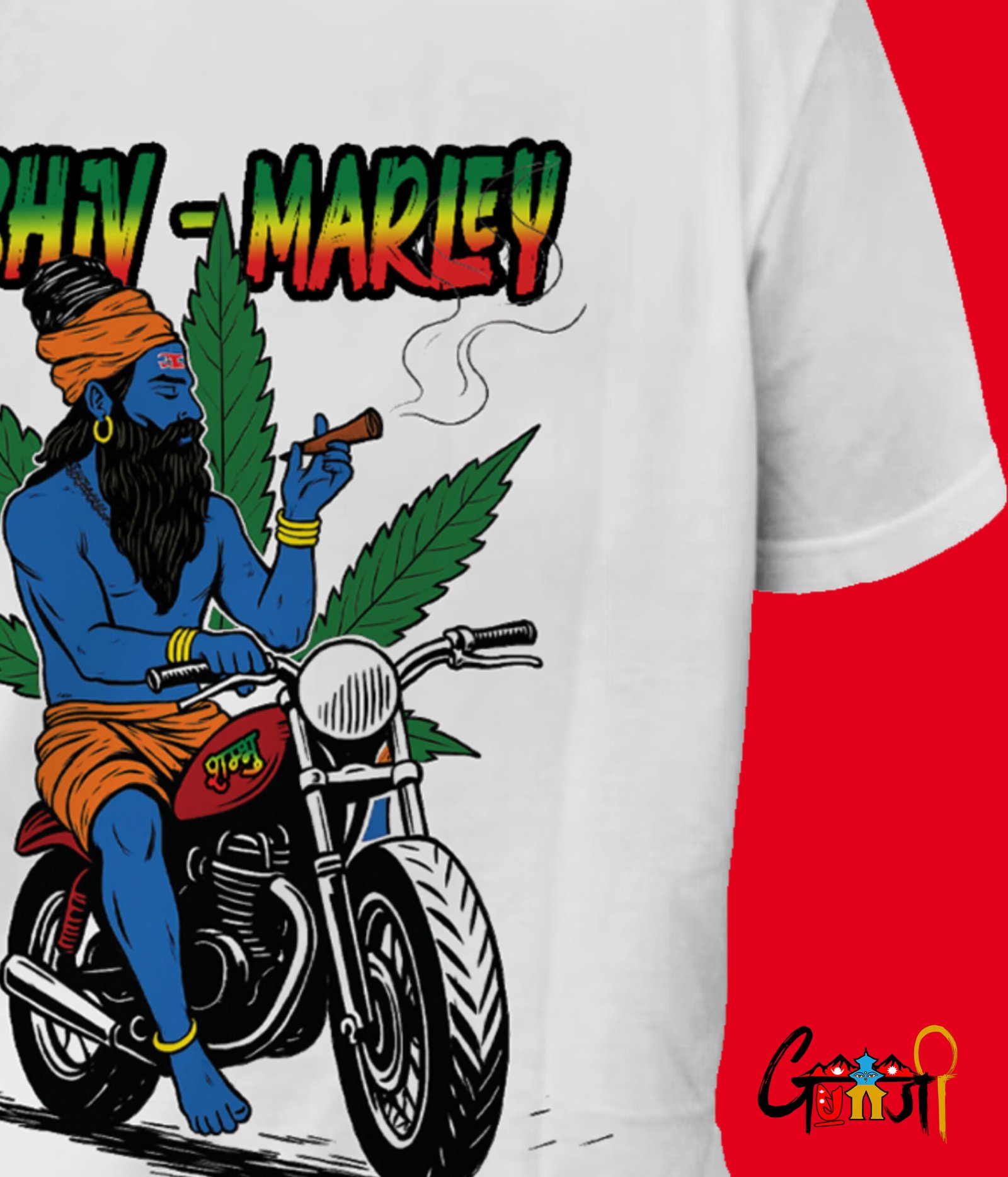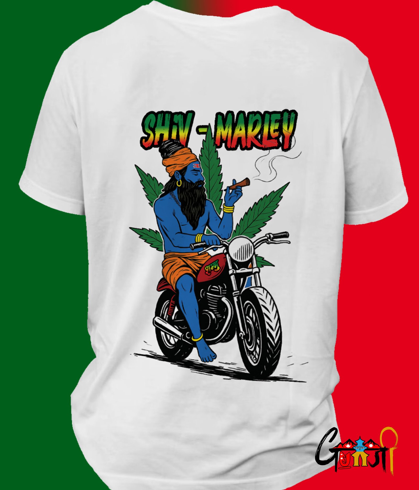 A bold and spiritual fusion of two legends – Lord Shiva and Bob Marley – brought to life on a uniquely designed T-shirt. Featuring Shiva riding a bike, smoking chillum, with a marijuana leaf background and the words “Shiv Marley,” this T-shirt is perfect for those who vibe with freedom, music, and spirituality. Exclusively made for the Nepali, Indian community in Poland who carry their culture with pride.