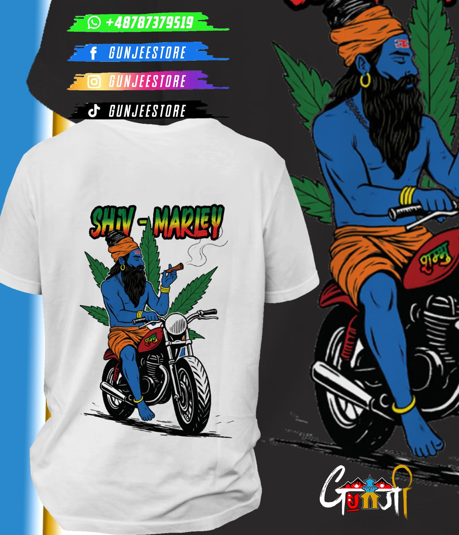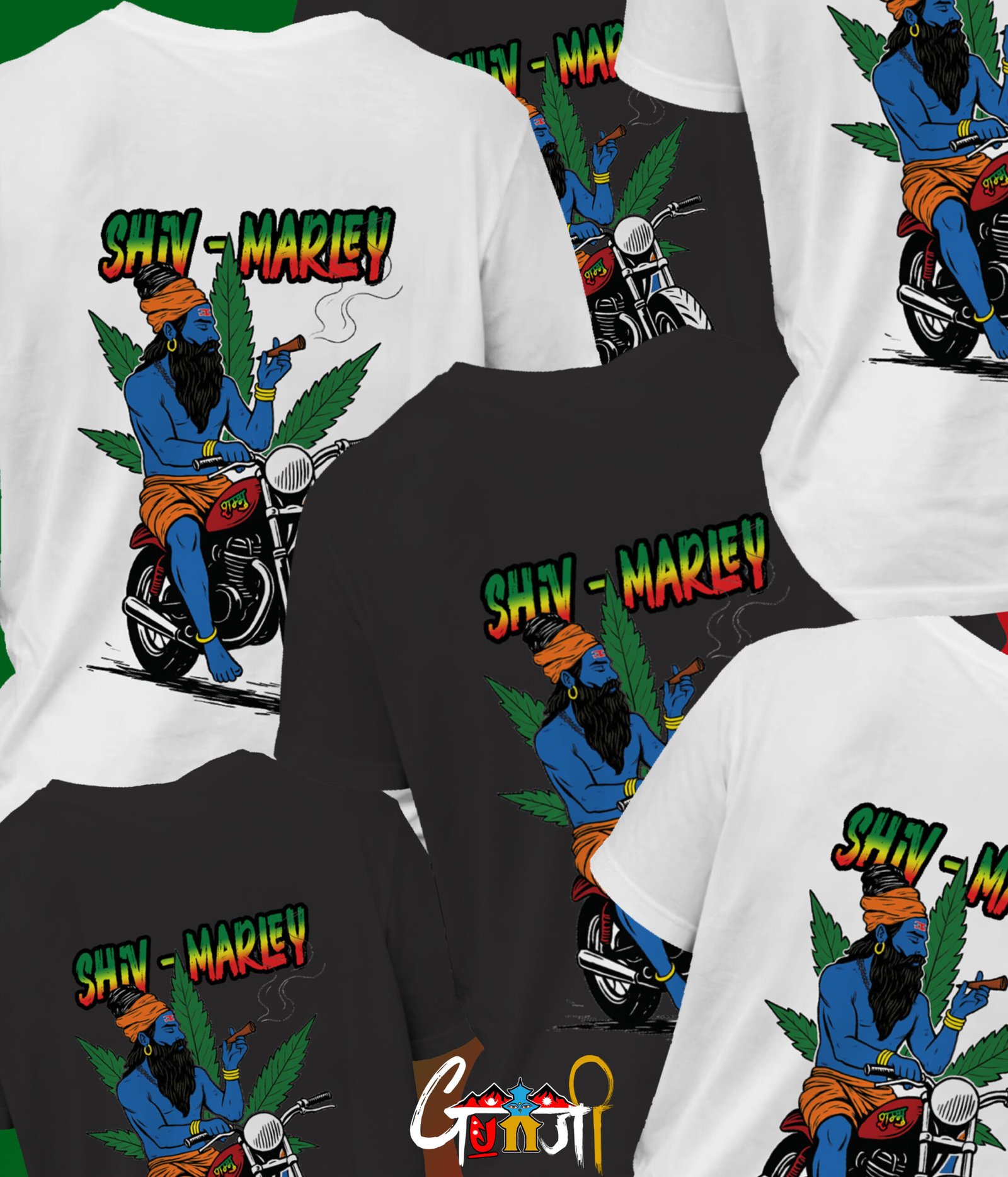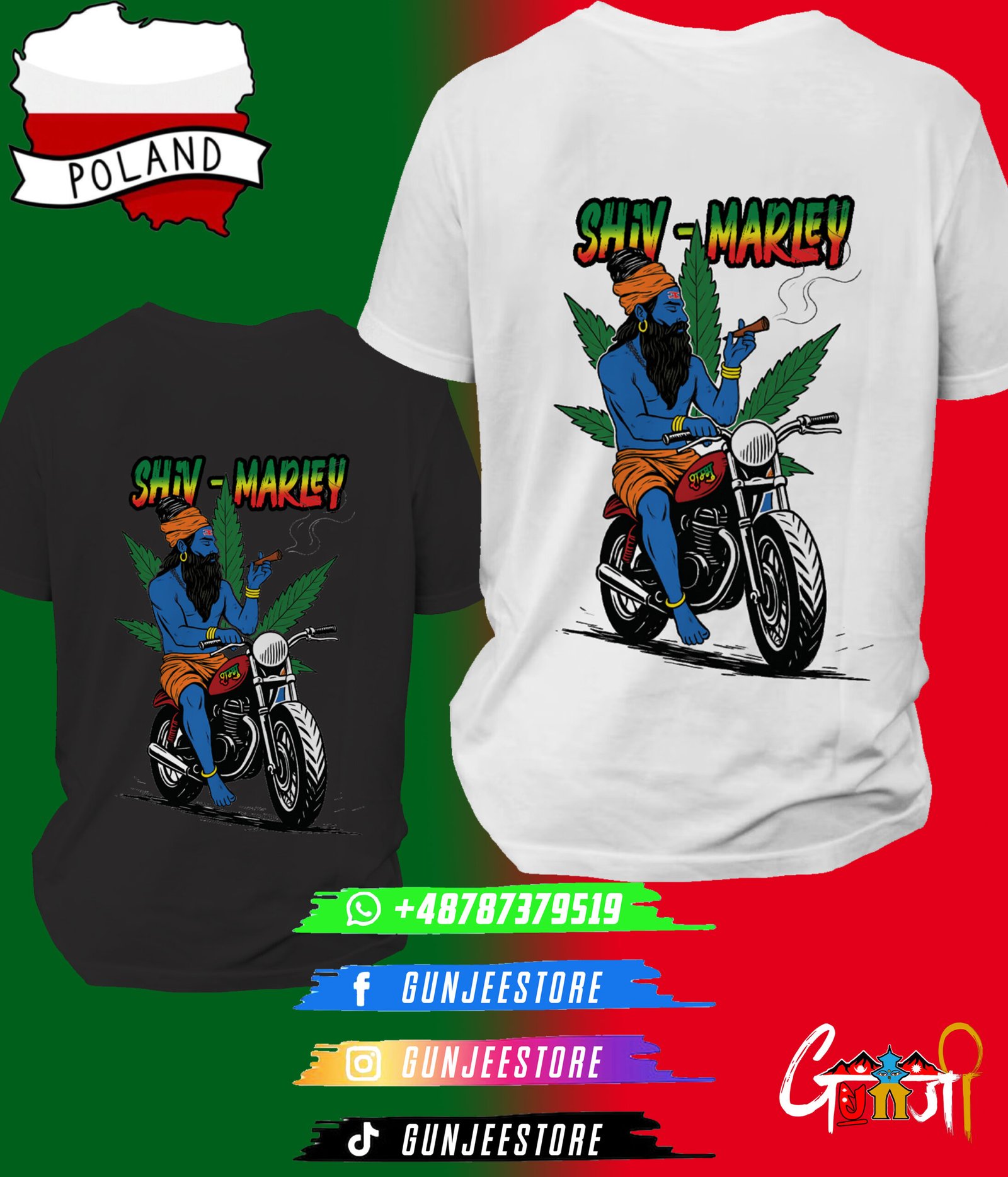 A bold and spiritual fusion of two legends – Lord Shiva and Bob Marley – brought to life on a uniquely designed T-shirt. Featuring Shiva riding a bike, smoking chillum, with a marijuana leaf background and the words “Shiv Marley,” this T-shirt is perfect for those who vibe with freedom, music, and spirituality. Exclusively made for the Nepali, Indian community in Poland who carry their culture with pride.